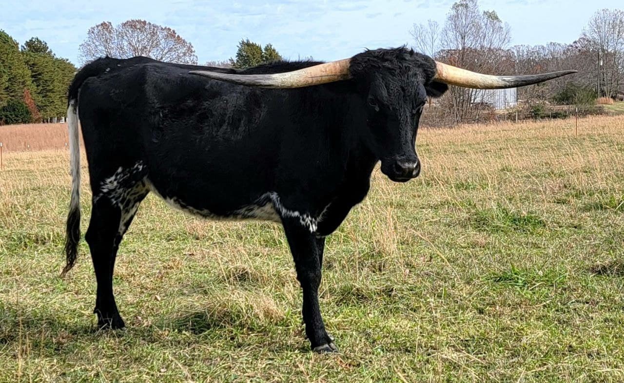 Low, tightly twisting lateral horn in a True Black cow. Very gentle disposition. She gave us a sweet True Black heifer as her first calf. A parker Brown heifer as her 2nd, another True Black for #3, and a 4th True Black as her 4th calf! Exposed to PCC Dark Spell!