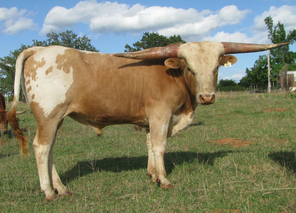 6 Time Total Horn Champion with 106.75" Total horn. He passes thick backswept horns to his calves along with sturdy body and often his beautiful golden color. Great disposition on this gorgeous boy!
