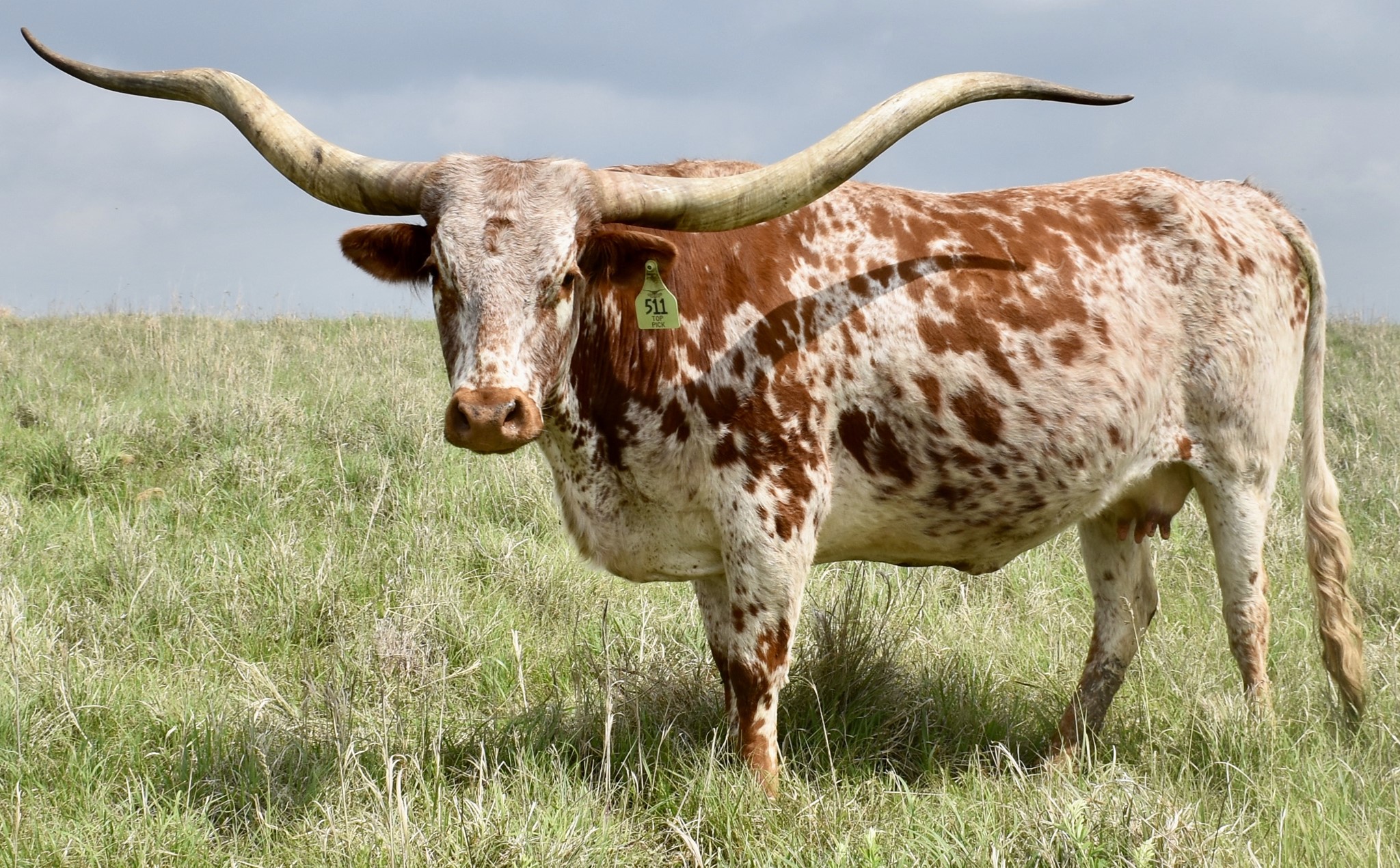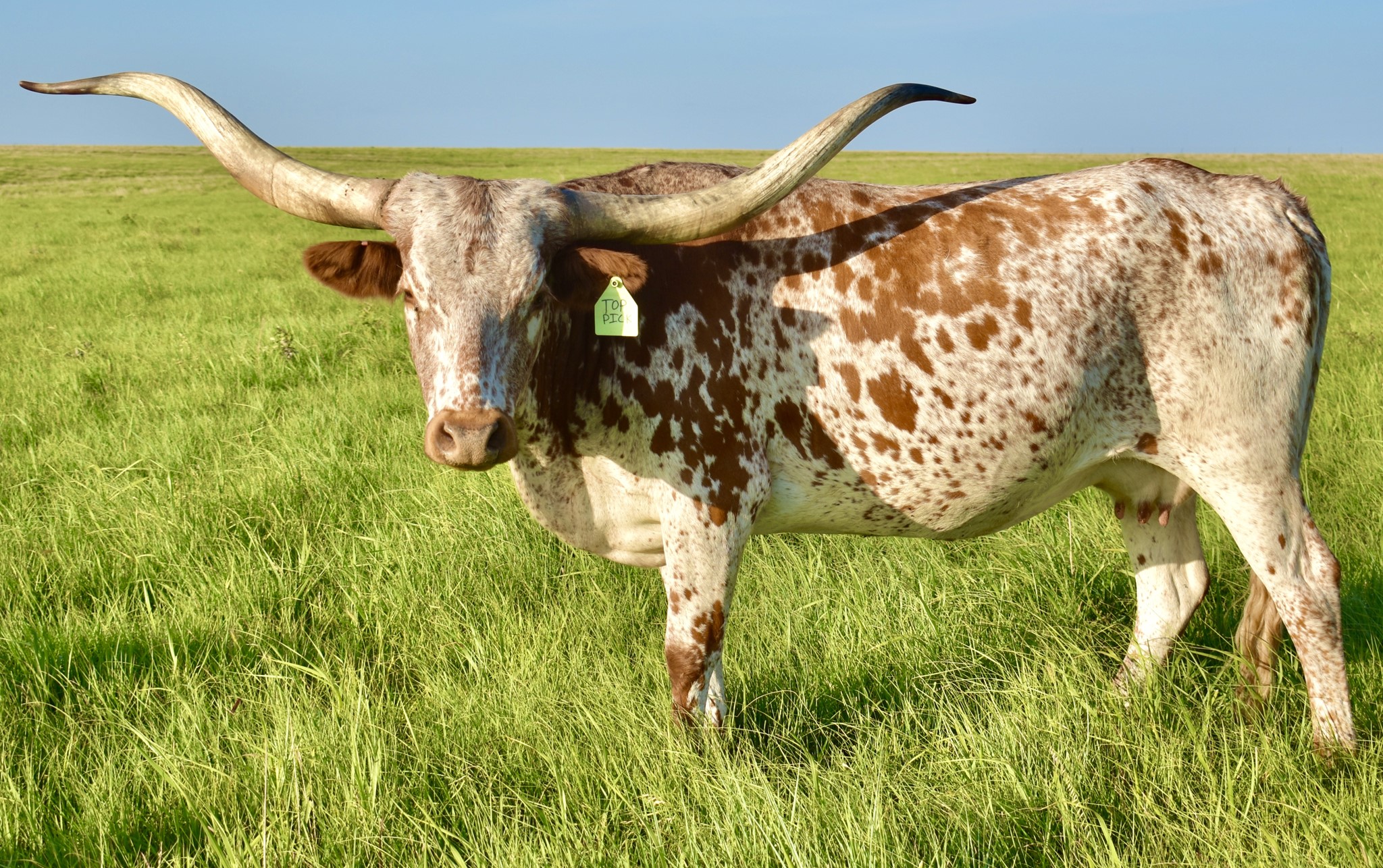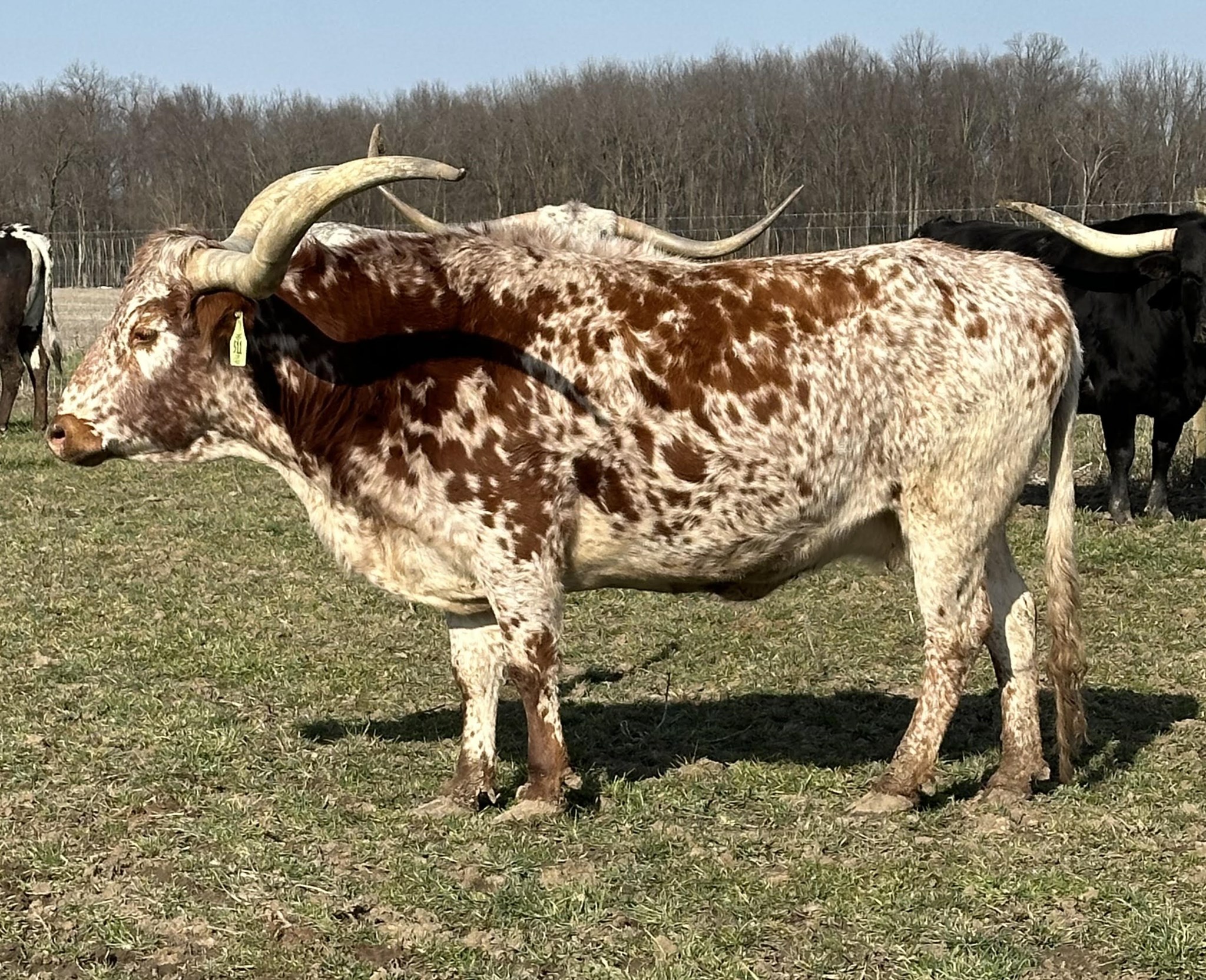 -OCV'd; JOHNE'S NEG; THIS YOUNG TOP CALIBER DAUGHTER HAS A RARE HORN SET THAT GOES BACK HARD WITH A TRIPLE TWIST AND LATERAL EXTENSION WELL INTO THE 80'S TTT.SHE COMES WITH AN EXTRAORDINARY HEIFER AT SIDE BY PCC CACTUS JACK (87''TTT @ 3y) BORN 5/30/23. CONFIRMED BRED TO FUTURITY WINNER BLUE MOON GLR( 7 over 90";24 over 80" in pedigree) .