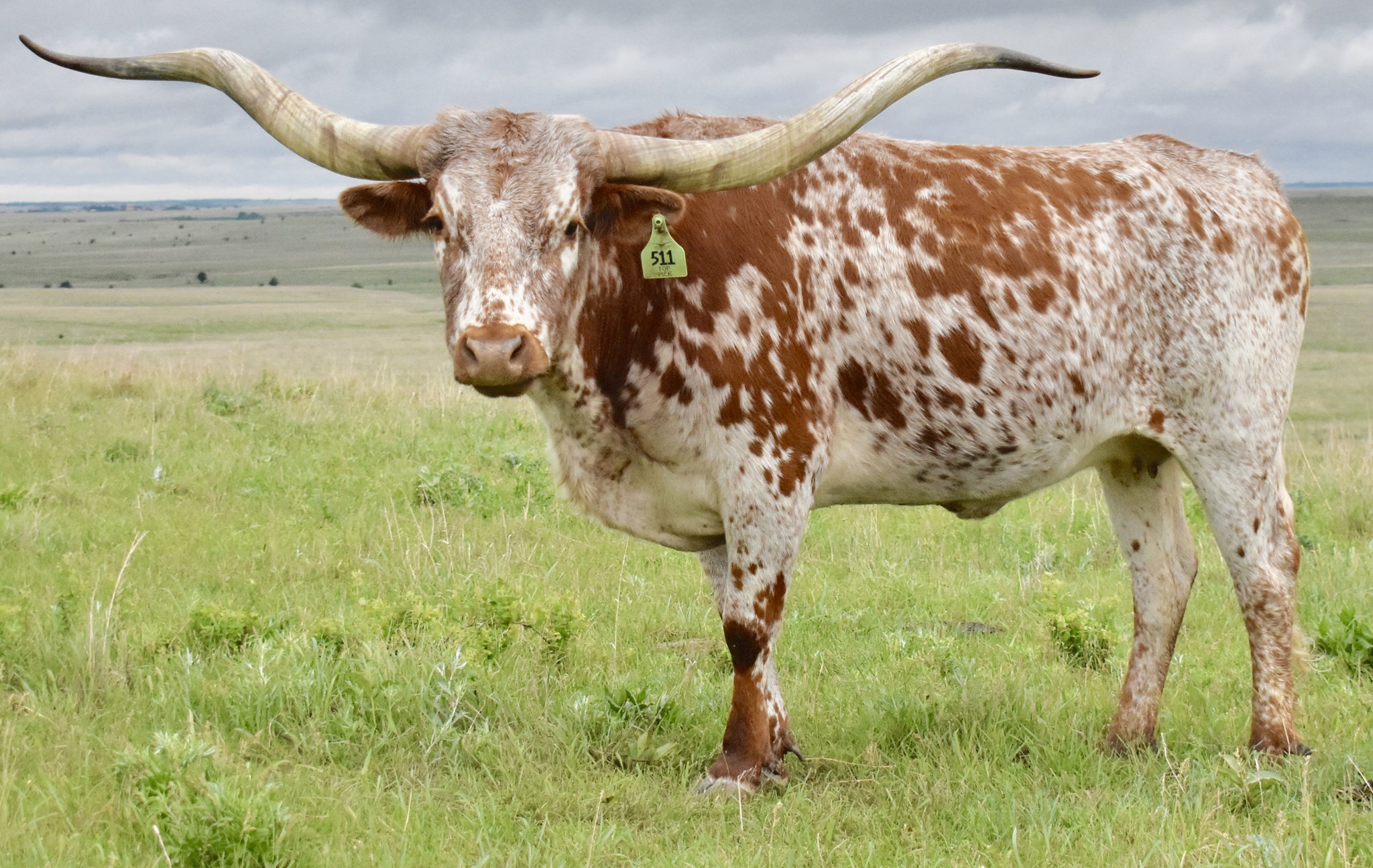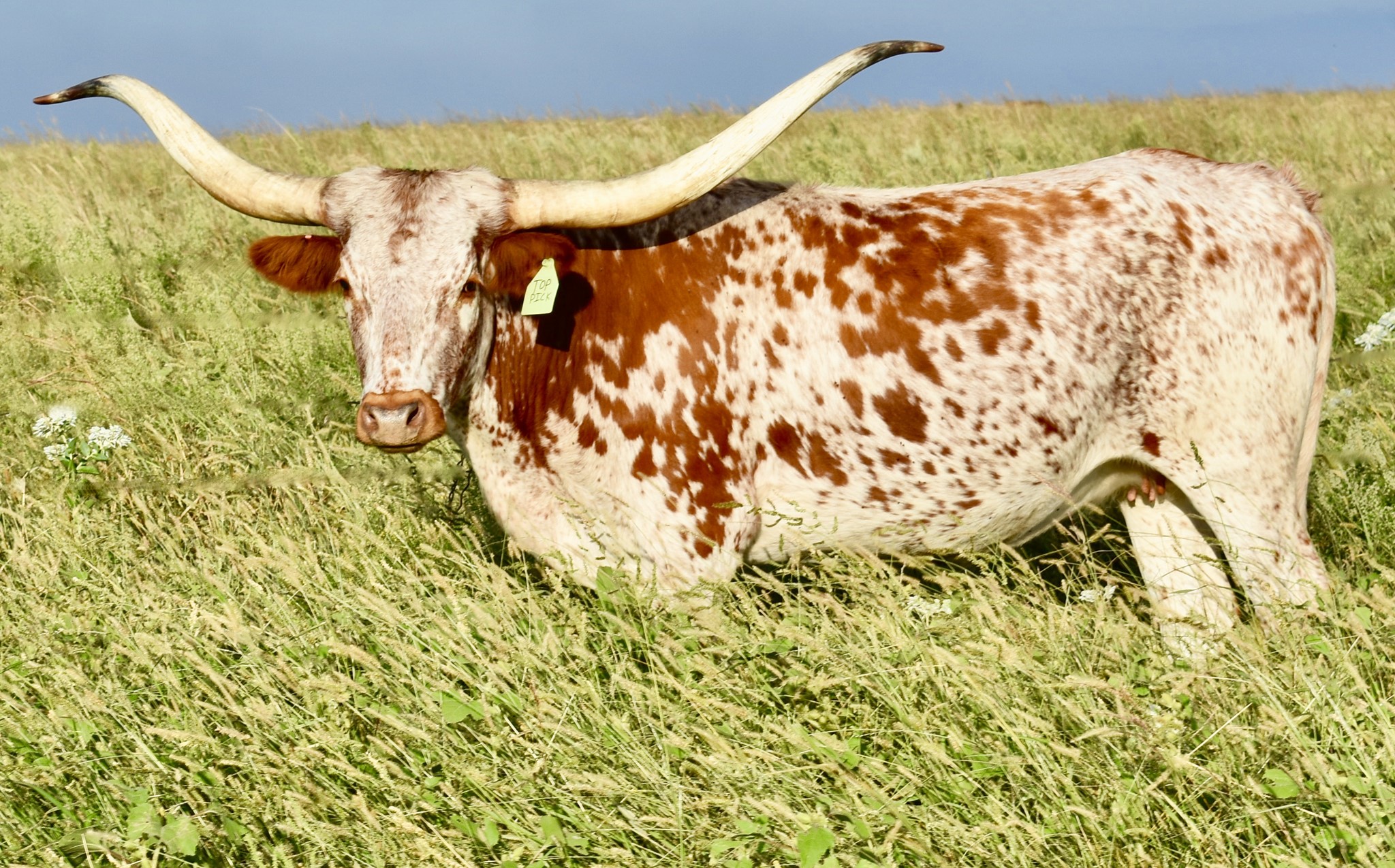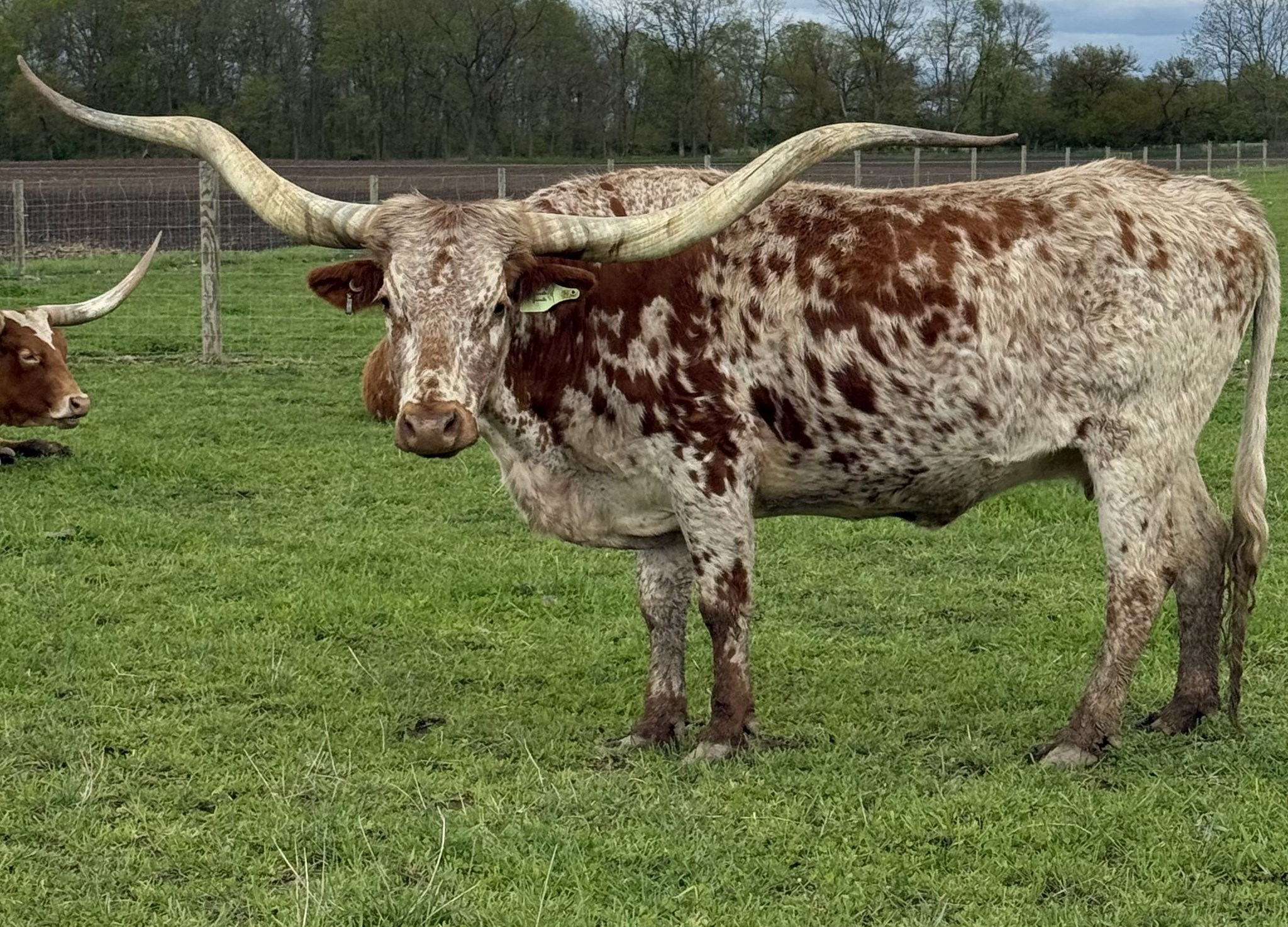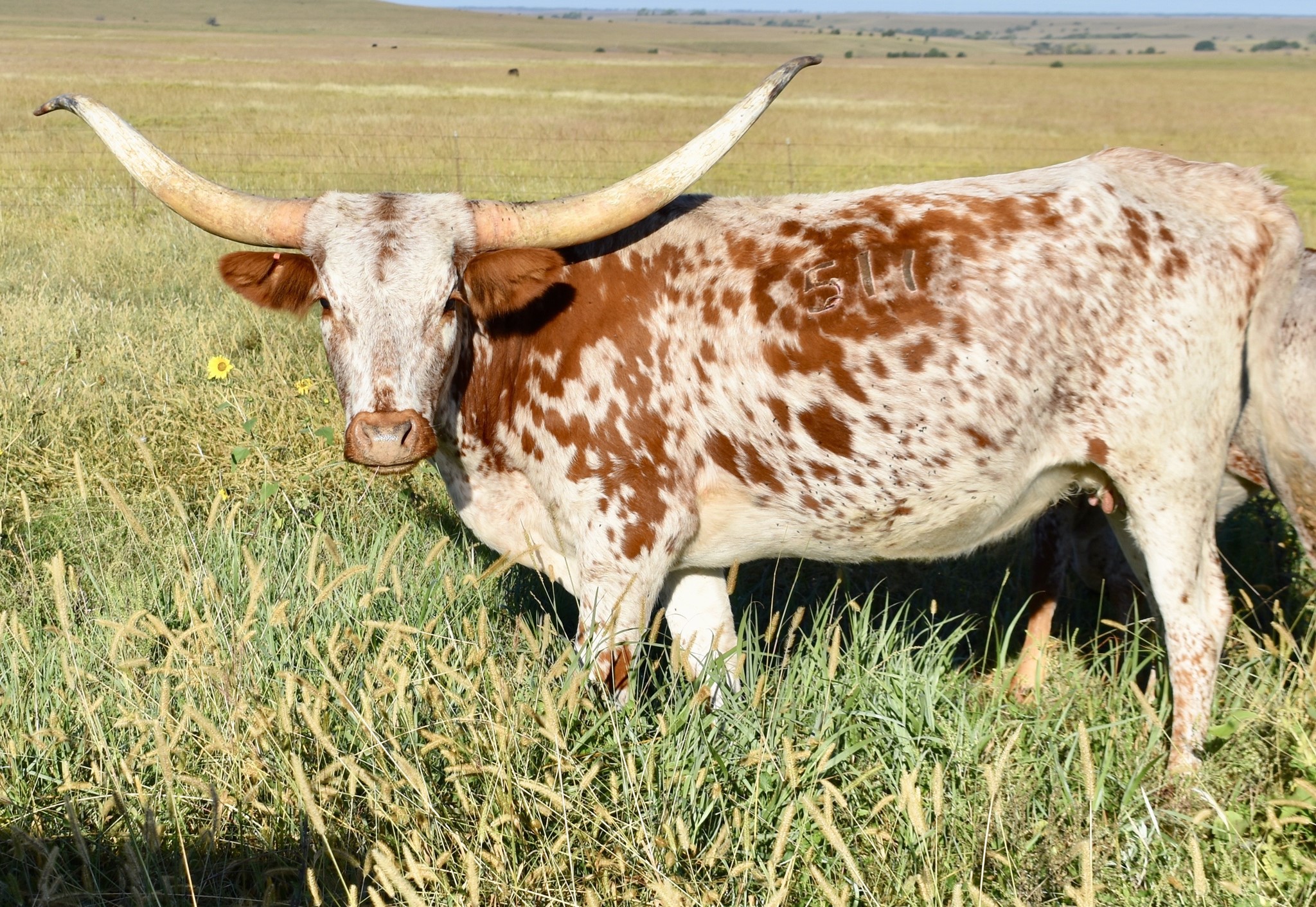 -OCV'd; JOHNE'S NEG; THIS YOUNG TOP CALIBER DAUGHTER HAS A RARE HORN SET THAT GOES BACK HARD WITH A TRIPLE TWIST AND LATERAL EXTENSION WELL INTO THE 80'S TTT.SHE COMES WITH AN EXTRAORDINARY HEIFER AT SIDE BY PCC CACTUS JACK (87''TTT @ 3y) BORN 5/30/23. CONFIRMED BRED TO FUTURITY WINNER BLUE MOON GLR( 7 over 90";24 over 80" in pedigree) .